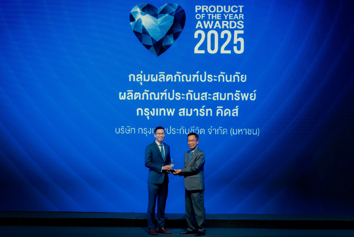 กรุงเทพประกันชีวิต ตอกย้ำความสำเร็จจากผลิตภัณฑ์ประกันสะสมทรัพย์ “กรุงเทพ สมาร์ท คิดส์” ที่สามารถคว้ารางวัล “Product of the Year Awards 2025” ในงานมอบรางวัลสินค้าและบริการแห่งปี 2568 “BUSINESS+ PRODUCT OF THE YEAR AWARDS 2025” ภายใต้แนวคิด “Reaching for the Hearts เข้าถึงใจผู้บริโภค” เพื่อยกย่องและเชิดชูเกียรติให้แก่ผลิตภัณฑ์และบริการที่ได้รับความนิยมจากลูกค้าแห่งปี 2568 ที่ผ่านการวิจัยและวิเคราะห์จากคณะกรรมการผู้ทรงคุณวุฒิ และผ่านการโหวตคัดเลือกจากผู้บริโภค จัดโดย นิตยสาร Business+ ร่วมกับ วิทยาลัยการจัดการ มหาวิทยาลัยมหิดล โดยมี นายทรงพล ปรีดาวุฒิ ผู้อำนวยการอาวุโส ฝ่ายพัฒนาและบริหารผลิตภัณฑ์ บริษัท กรุงเทพประกันชีวิต จำกัด (มหาชน) (ซ้าย) ขึ้นรับรางวัลจาก นายนุรักษ์ มาประณีต องคมนตรี (ขวา) ที่ได้ให้เกียรติเป็นประธานในพิธี ณ โรงแรมสวิสโฮเต็ล กรุงเทพฯ รัชดา เมื่อเร็วๆ นี้