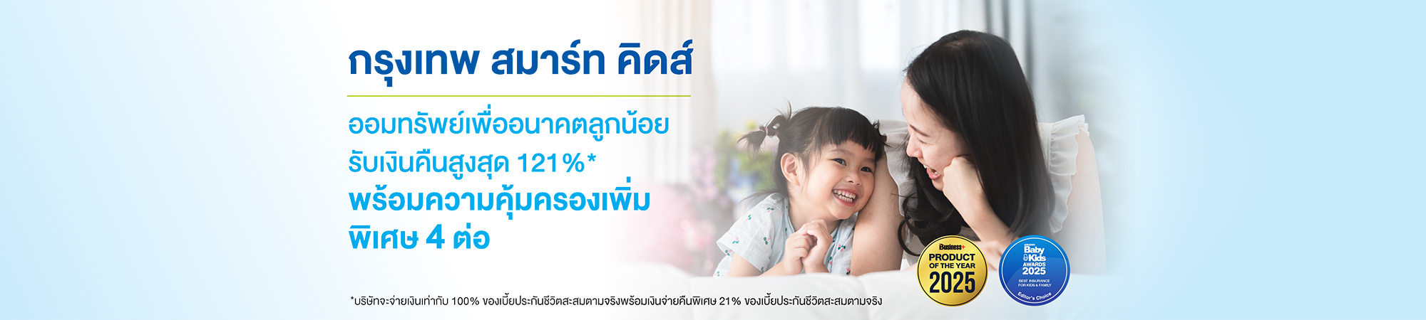 - สื่อโฆษณาฉบับนี้เป็นเพียงการสรุปผลประโยชน์เบื้องต้นเท่านั้น โปรดทำความเข้าใจในรายละเอียดเงื่อนไข ความคุ้มครองและข้อยกเว้น ก่อนการตัดสินใจทำประกันภัย ทั้งนี้ เงื่อนไขความคุ้มครองและข้อยกเว้นอย่างสมบูรณ์ สามารถสอบถามได้จากตัวแทนของท่าน หรือสามารถศึกษารายละเอียดได้จากกรมธรรม์ประกันชีวิตของท่าน